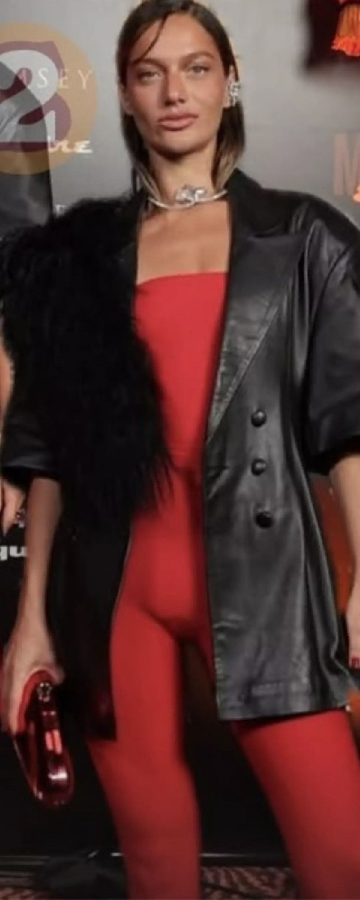 Geceye kırmızı iç belli eden tayt tulum ile katılan Gülcan Arslan bu haliyle pek beğenilmedi. Kombinini deri ceketi ve ışıltılı bir kolye ile tamamlayan Arslan’ın cesur tarzı yorum yağmuruna tutuldu.