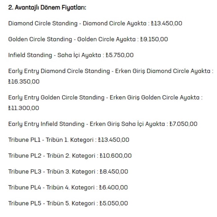 Ancak bilet fiyatları dudak uçuklattı. Passo’dan satışa çıkan biletlerin en ucuzu 5 bin 50 TL ile en arka tribün. Saha içi ayakta kategorisindeki en ucuz bilet fiyatı ise 5 bin TL.