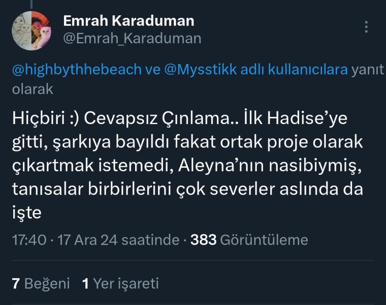 Karaduman, X’teki bir kullanıcının o ismin Demet Akalın olabileceğine dair yaptığı yoruma şu cevabı verdi: