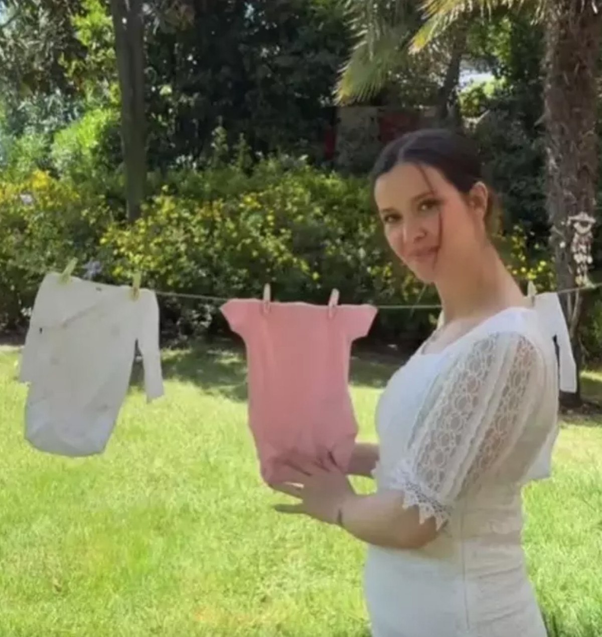 İrem Helvacıoğlu, askıya pembe bebek elbisesi asan ünlü oyuncu, kızı olacağını müjdeledi.