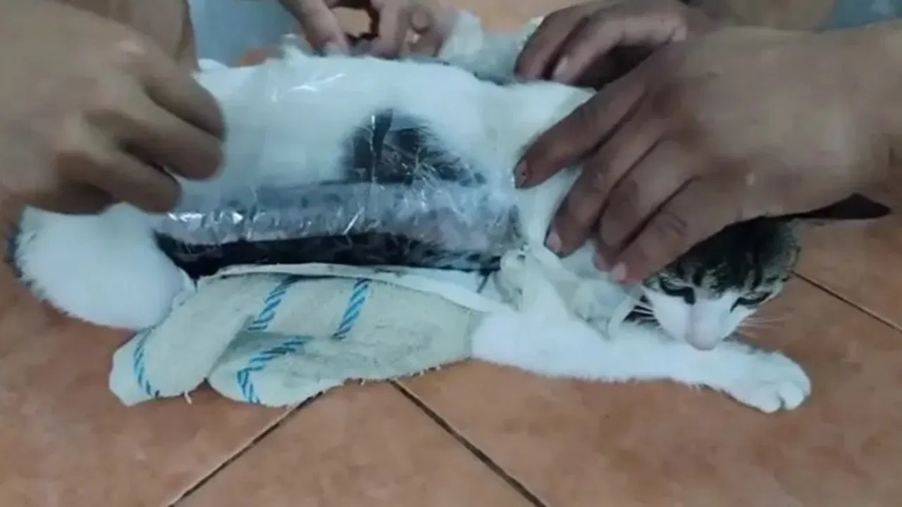 Bakanlığın yayımladığı videoda, bir gardiyanın siyah-beyaz tüylere sahip zayıf kediyi yakalamak için tel örgüye tırmandığı ve ardından uyuşturucuları kedinin üzerinden dikkatle çıkarıldığı görülüyor.