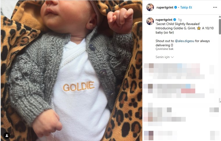 Ancak ünlü oyuncu, bebeğin cinsiyetine dair bir bilgi paylaşmadı. Grint’in minik Goldie ile paylaştığı fotoğraf kısa sürede büyük ilgi gördü.