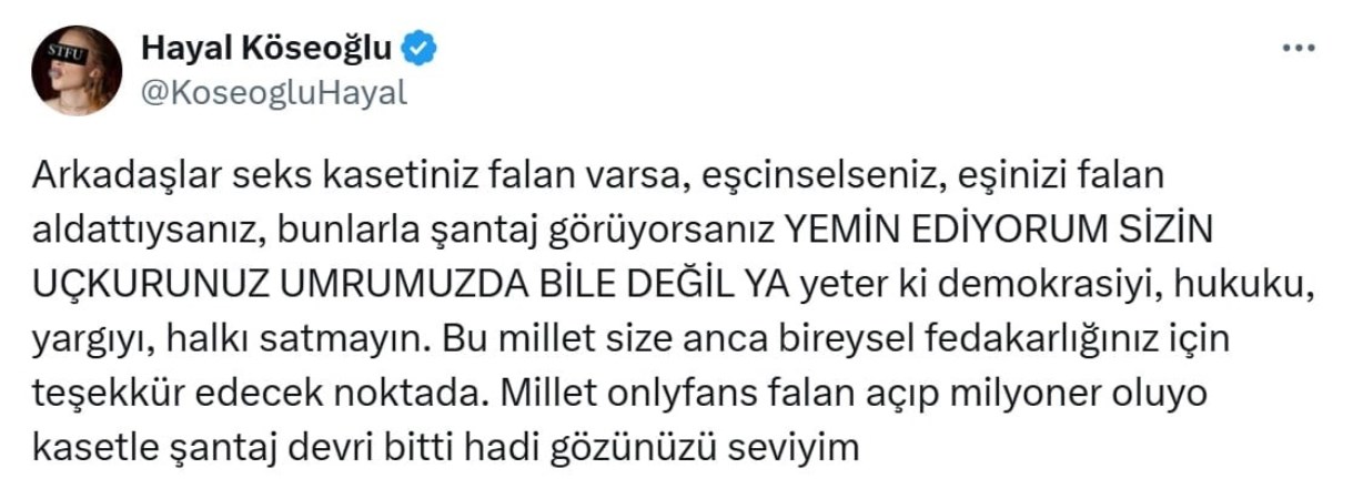 “Arkadaşlar seks kasetiniz falan varsa, eş cinselseniz, eşinizi falan aldattıysanız, bunlarla şantaj görüyorsanız yemin ediyorum sizin uçkurunuz umrumuzda bile değil ya. Yeter ki demokrasiyi, hukuku, yargıyı, halkı satmayın. Bu millet size anca bireysel fedakarlığınız için teşekkür edecek noktada. Millet Onlyfans falan açıp milyoner oluyor, kasetle şantaj devri bitti, hadi gözünüzü seveyim.”