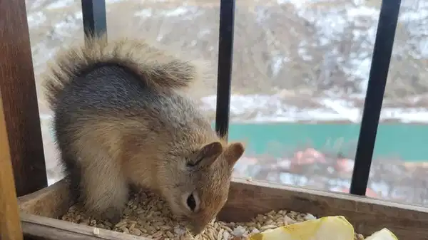 Ayhan, “Bahçeli bir evde yaşıyorum. Don nedeniyle bu sene ağaçlarda meyve olmadı. Kış da çok ağır geçti. Sadece sincaplar değil; çakal, kuş, serçe, karga hepsi mağdur. Bir gün evde otururken bir sincap geldi. Zamanla arkadaş olduk. Şu an birlikte vakit geçiriyoruz. Birbirimizi anlıyoruz. Yemeğini almaya geliyor, böyle zaman geçiriyoruz” dedi.