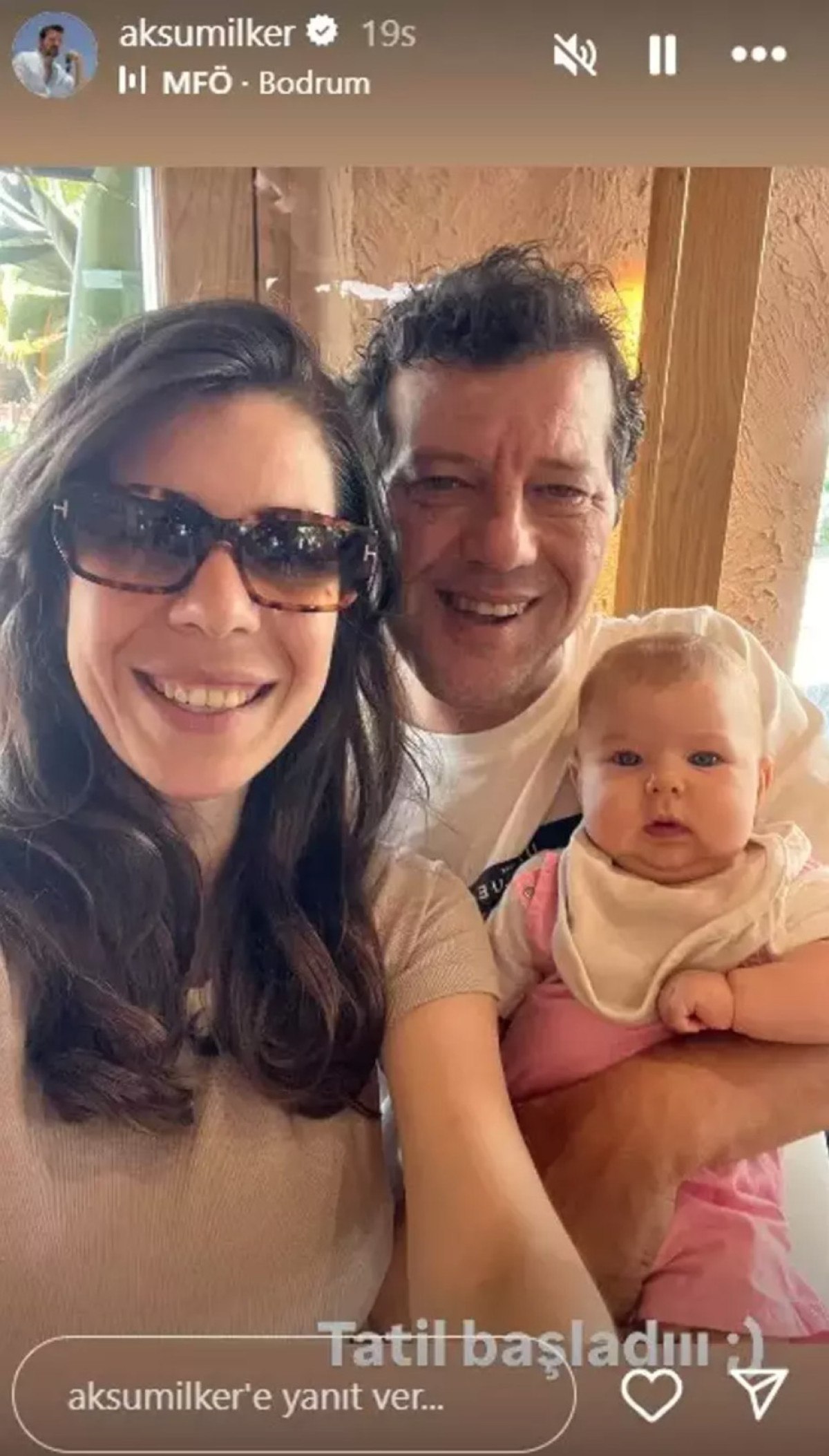 Aksum, sosyal medya hesabından eşi ve kızıyla verdiği bir pozu yayınlayarak “Tatil başlasın” notunu yazdı.