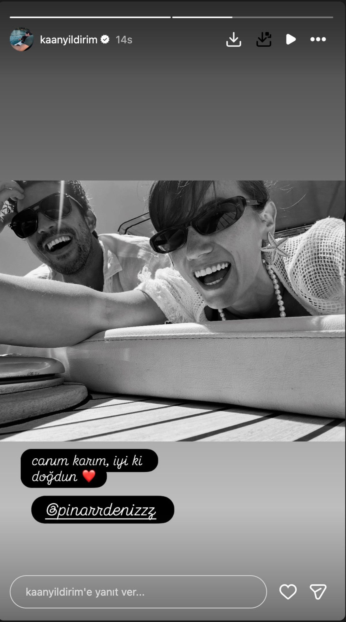 Kaan Yıldırım, bugün yeni yaşına giren eşiyle romantik bir pozunu yayınlayarak “Canım karım iyi ki doğdun” notunu yazıp kalp emojisi ekledi.