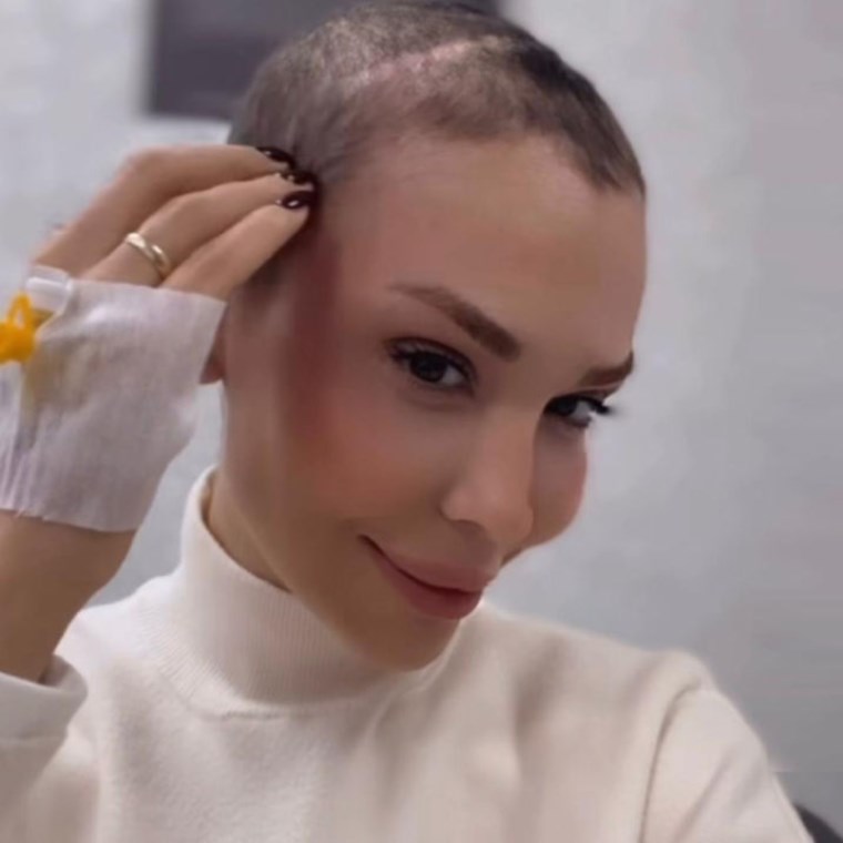 İlaç tedavisi nedeniyle dökülen saçlarının yeniden çıkmaya başladığını belirten şarkıcı, “Rutin kontroller… Beyin MR’ı çektiriyoruz. Bu arada saçlarım yerine gelmeye başladı. Bir daha beni terk etmezler inşallah” ifadelerini kullandı.