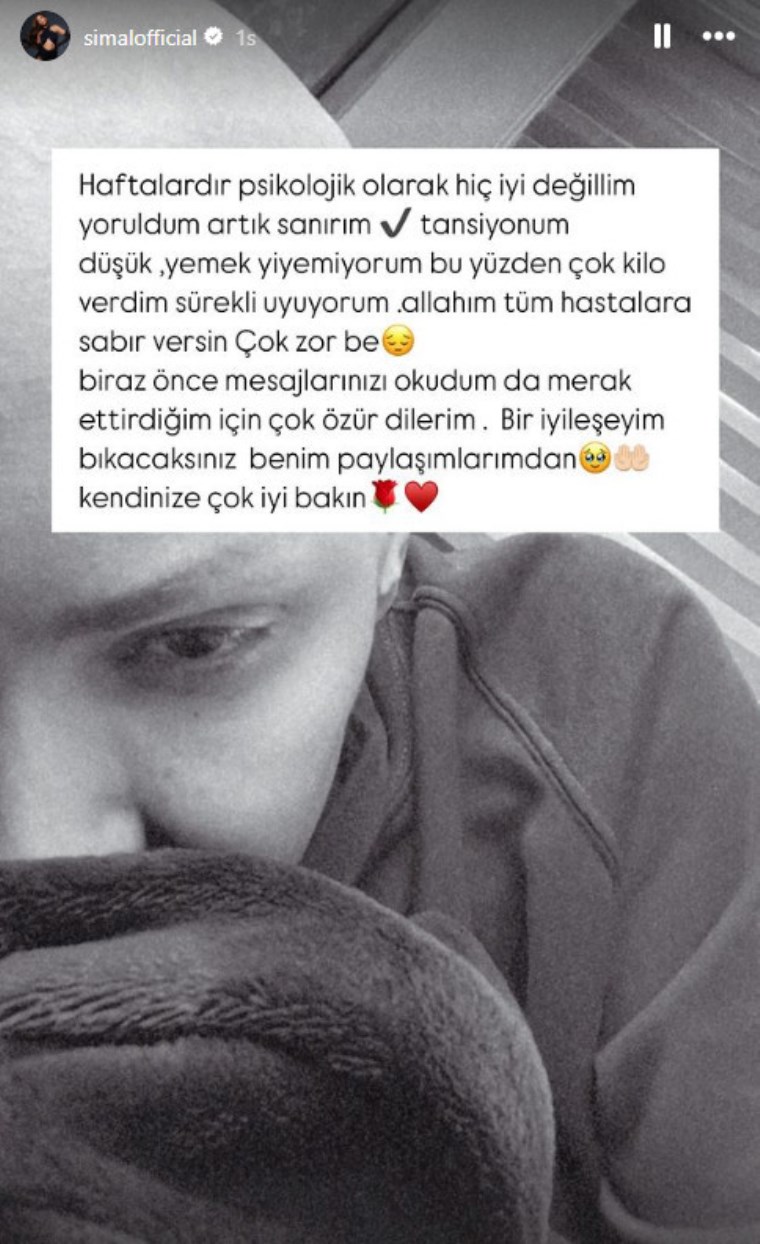 Şimal, “Haftalardır psikolojik olarak iyi değilim. Yoruldum artık sanırım. Tansiyonum düşük, yemek yiyemiyorum. Bu yüzden çok kilo verdim. Sürekli uyuyorum. Allahım tüm hastalara sabır versin. Çok zor be. Biraz önce mesajlarınızı okudum da merak ettirdiğim için özür dilerim. Bir iyileşeyim bıkacaksınız paylaşımlarımdan. Kendinize çok iyi bakın” mesajını yazdı.
