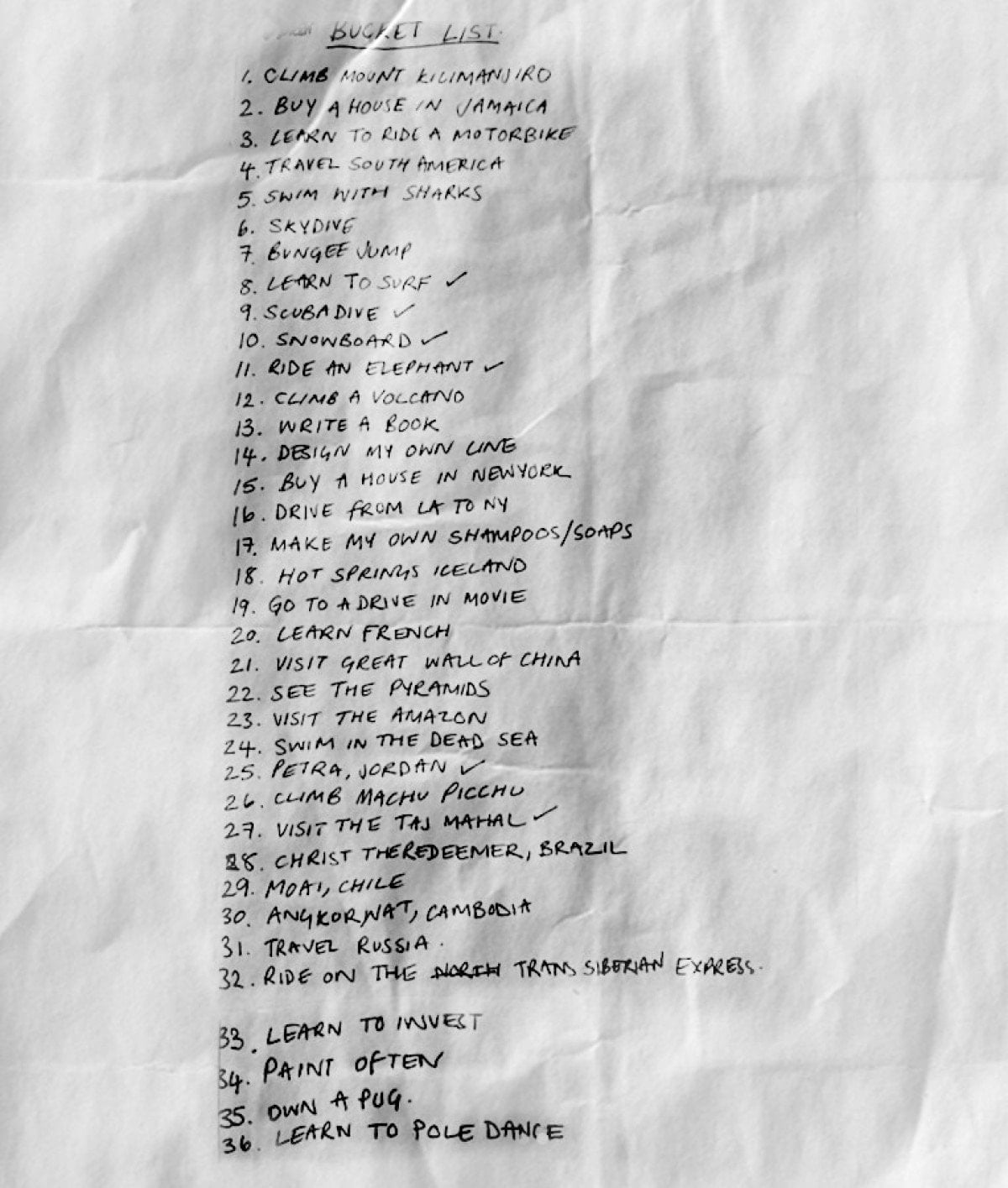 Listede Rusya, Brezilya, Şili ve Çin Seddi gibi birçok yere gitmek yer alırken; köpekbalıklarıyla yüzmek, ‘bungee jumping’ yapmak ve ‘direk dansı öğrenmek’ gibi maddeler de bulunuyor.