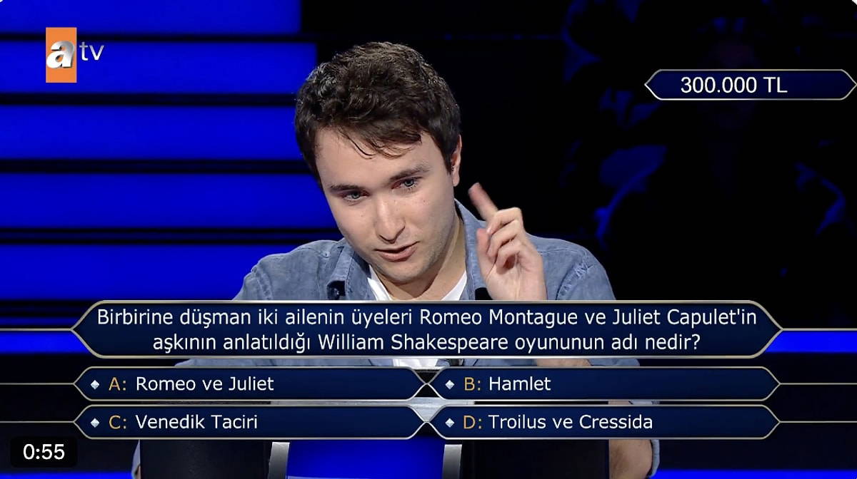 Yarışmacıya, “Birbirine düşman iki ailenin üyeleri Romeo Montague ve Juliet Capulet’in aşkının anlatıldığı William Shakespeare oyununun adı nedir?” sorusu yöneltildi.