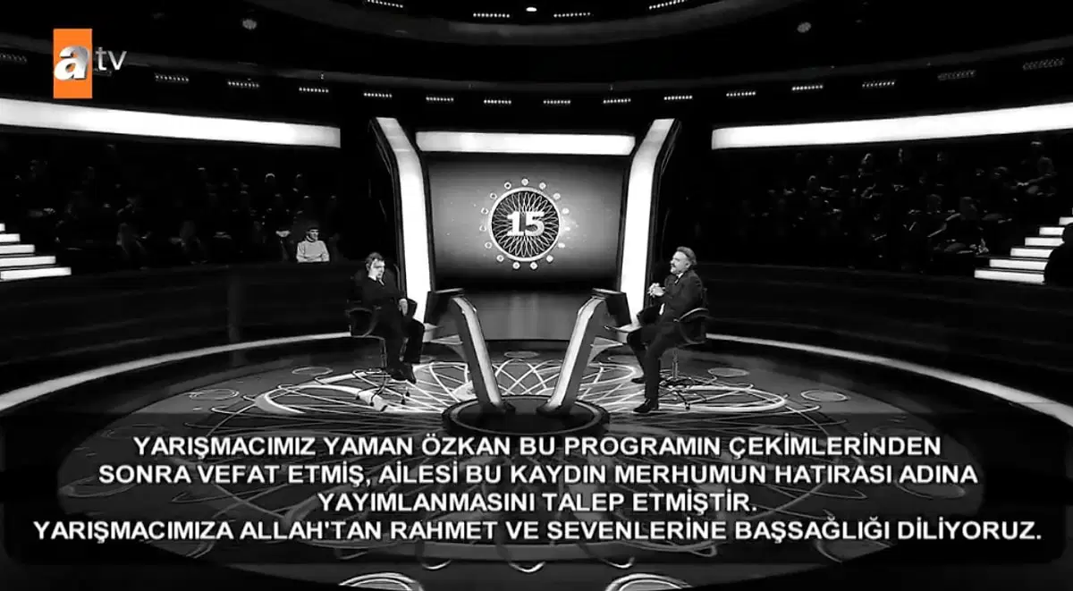 ATV ekranlarında yayınlanan ve Oktay Kaynarca’nın sunduğu Kim Milyoner Olmak İster yarışmasının son bölümünde duygusal anlar yaşandı. Programa katılan diş hekimi Yaman Özkan, yarışmadan elendikten kısa süre sonra geçirdiği rahatsızlık nedeniyle hayatını kaybetti.