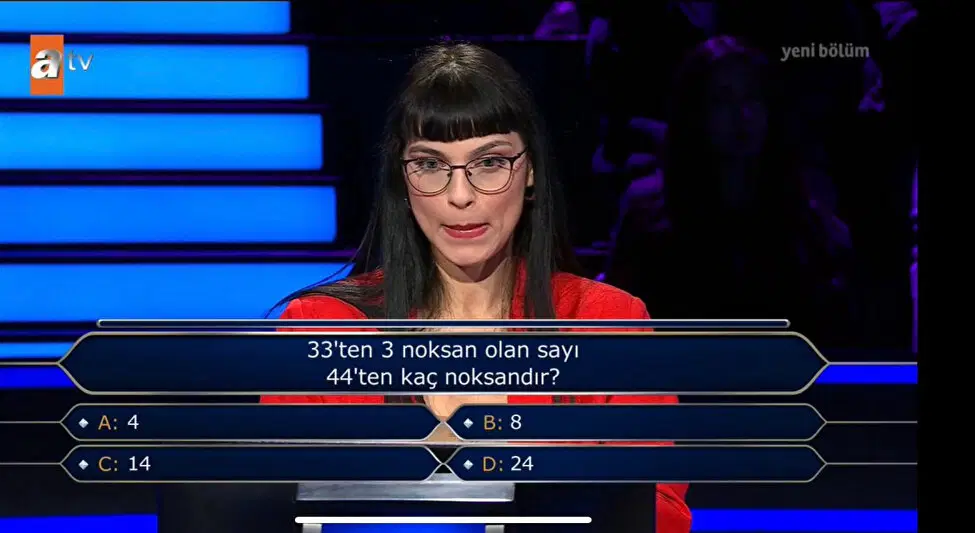 Oktay Kaynarca da “44’ten 30’u çıkarırsak kaç kalır” diyerek şoke oldu. Yarışmacı ise “Bana matematik sormayın söyleyemem” deyince Kaynarca “Bu matematik değil artık” diyerek şaşırdı.