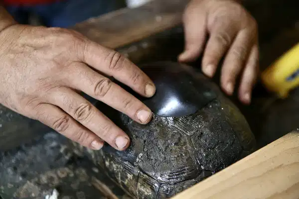 Doğa Dostu Derneği Başkanı Gökçen Gökmen Bayram’ın Nif Mahallesi yolunda bulduğu kaplumbağanın kabuğu, ahşap oyma ustası Kadir Güven tarafından ahşap mobilya kaplamalarında kullanılan doğal epoksi (reçine yapıştırıcı) ile onarıldı.