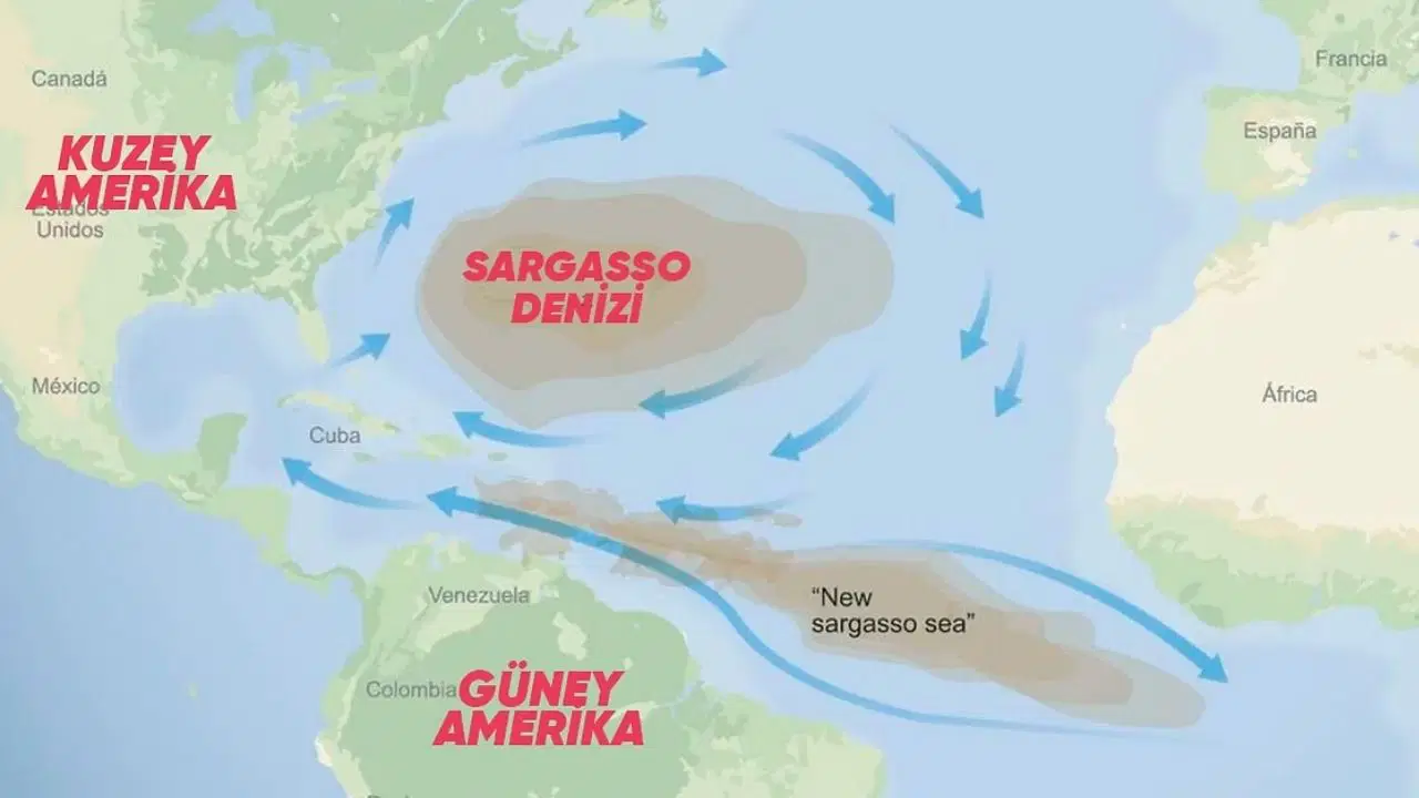 Sargasso Denizi, dört büyük akıntı tarafından çevreleniyor: batısında Körfez Akıntısı (Gulf Stream), kuzeyinde Kuzey Atlantik Akıntısı, doğusunda Kanarya Akıntısı ve güneyinde Kuzey Ekvator Akıntısı yer alıyor. Bu dev su kütlesi, akıntıların döngüsüyle sabit bir form oluşturuyor adeta görünmeyen duvarlarla çevrili bir “su adası” gibi.