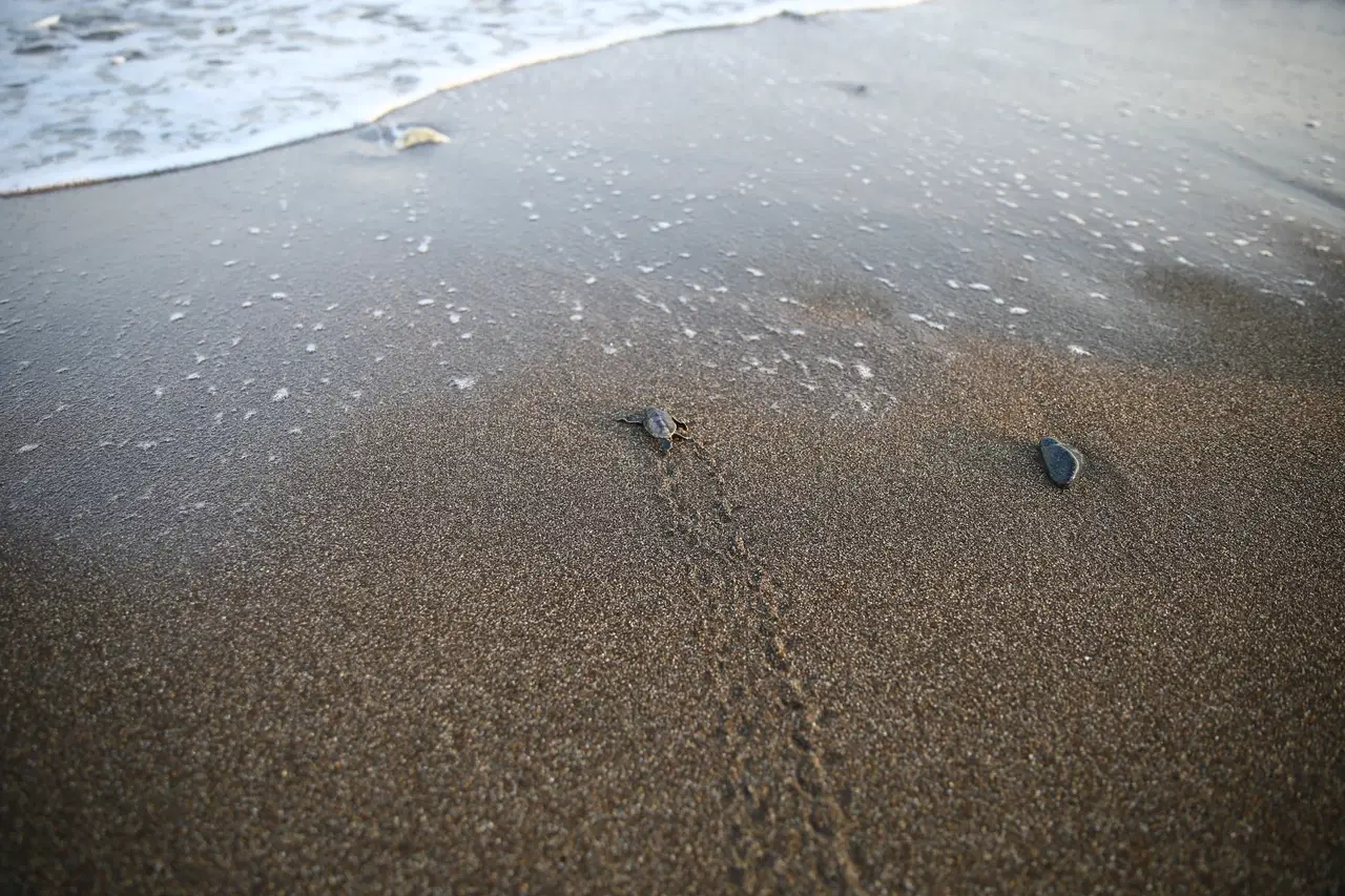 Mersin Üniversitesi (MEÜ) Deniz Kaplumbağaları Uygulama ve Araştırma Merkezi Müdürü Prof. Dr. Serap Ergene, merkez görevlileri ile gönüllü öğrencilerin gözetimindeki yavrular, kumsaldaki yolculuklarının ardından denize ulaştı.