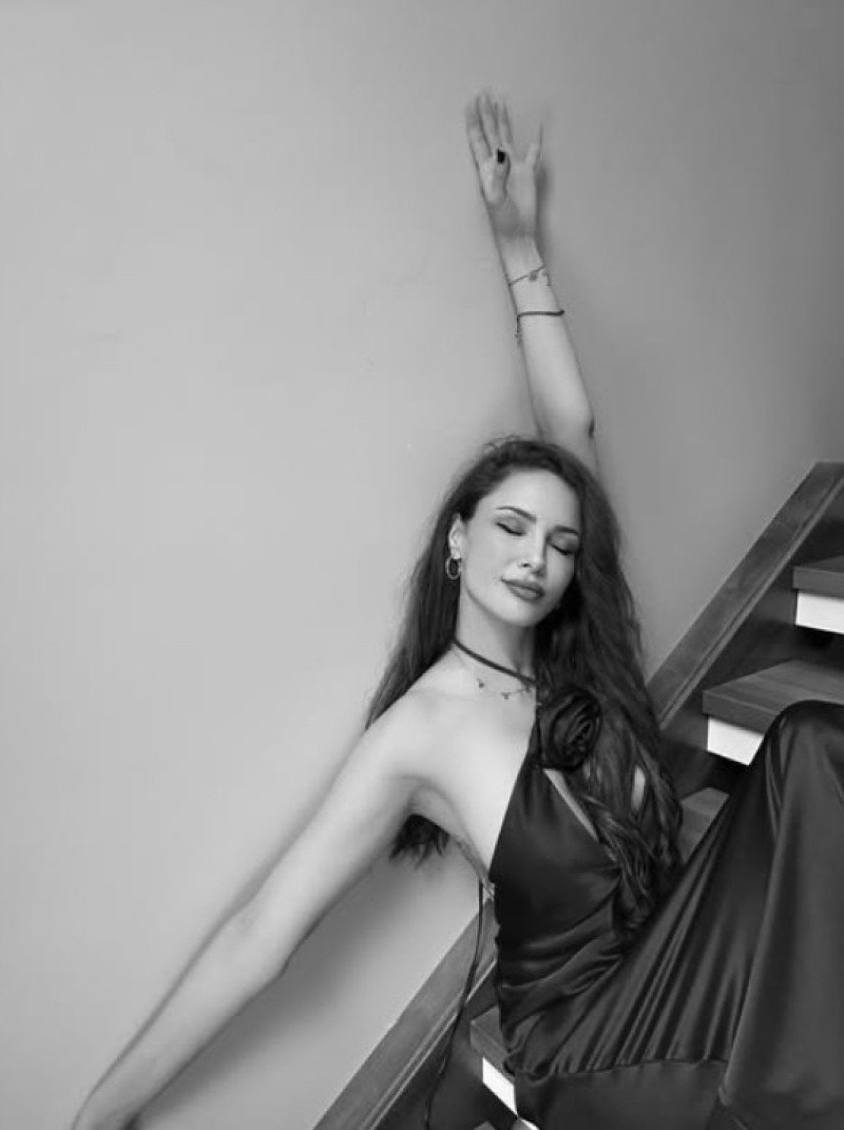 Başarılı oyuncu bu sefer de merdivenlerde poz verdi. İddialı göğüs dekoltesini saçlarıyla kapatan Tugay’a fanlarından beğeni ve kalp emojisi yağdı.