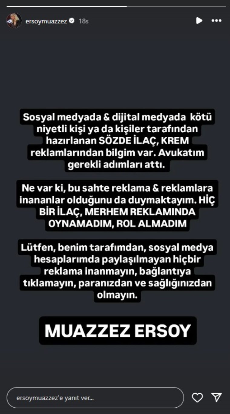 Durumu öğrenir öğrenmez avukatı aracılığıyla savcılığa suç duyurusunda bulunan Muazzez Ersoy, sosyal medya hesabından bir açıklama yaparak takipçilerini bilgilendirdi. Ünlü sanatçı, yaptığı paylaşımda şu ifadeleri kullandı: