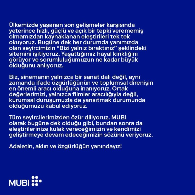 MUBI Türkiye’den “Adaletin, aklın ve özgürlüğün yanındayız!” açıklaması yapıldı.
