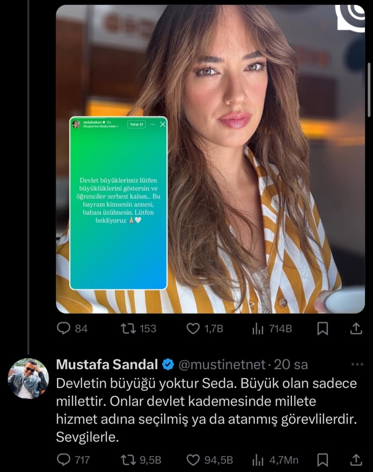 X hesabından Bakan’a cevap veren ünlü şarkıcı, “Devletin büyüğü yoktur Seda. Büyük olan sadece millettir. Onlar devlet kademesinde millete hizmet adına seçilmiş ya da atanmış görevlilerdir. Sevgilerle.” dedi.
