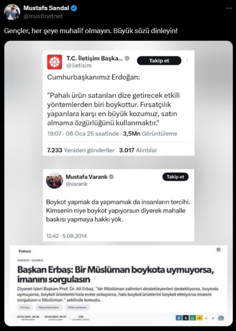 Boykota destek veren sanatçılar arasında yer alan Mustafa Sandal da sosyal medyadan yaptığı paylaşımda iktidar ve hükümet cephesinden gelen eski ‘boykot’ açıklamalarını paylaşarak “Gençler, her şeye muhalif olmayın. Büyük sözü dinleyin!” ifadelerini kullandı.