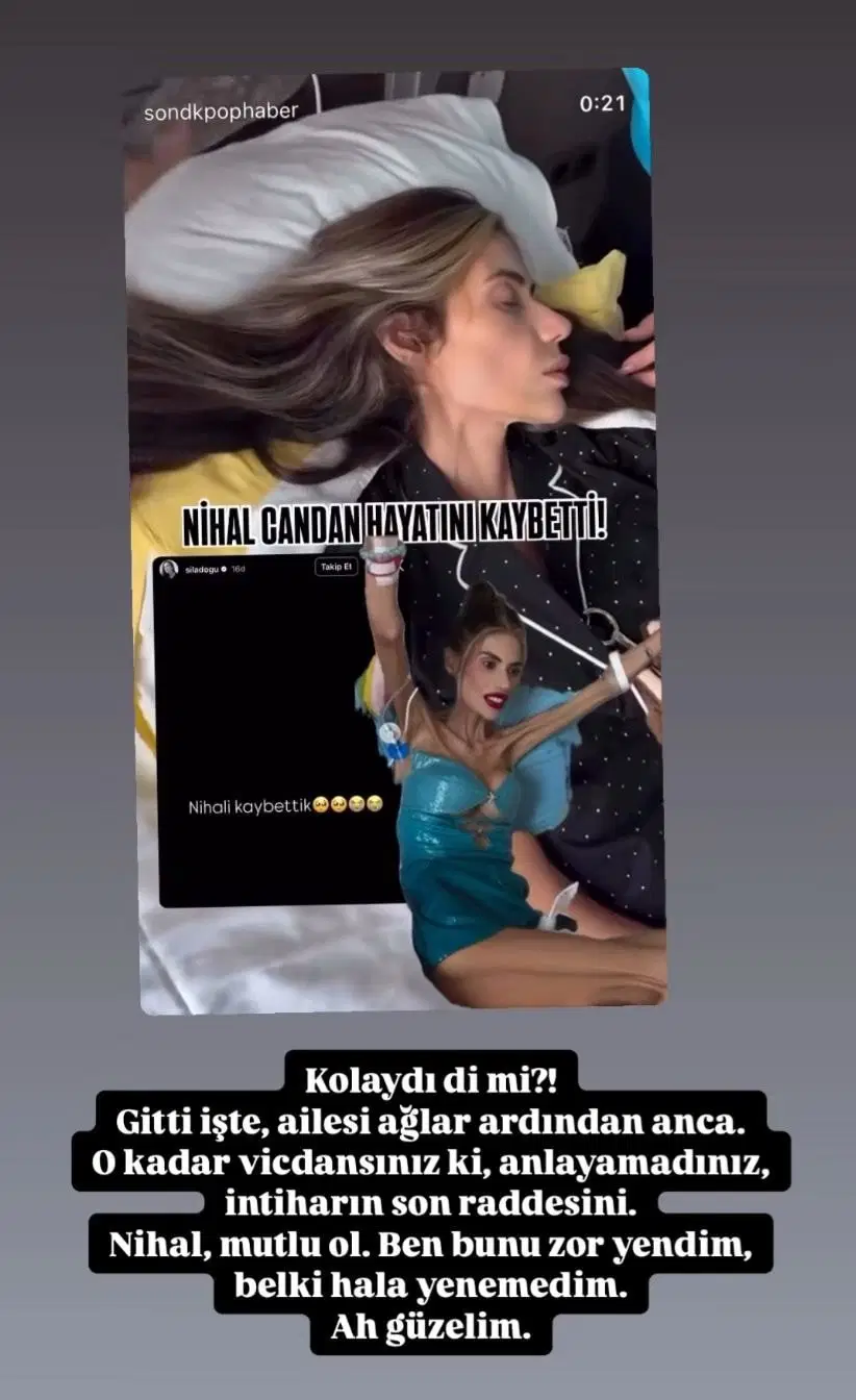 Ünlü şarkıcı İrem Derici, Nihal Candan’ın hayatını kaybetmesinin ardından yaptığı paylaşımda, “Kolaydı değil mi? Gitti işte… Ailesi ağlar ardından ancak. O kadar vicdansızsınız ki anlayamadınız intiharın son raddesini. Nihal mutlu oldu. Ben bunu zor yendim, belki hala yenemedim” ifadelerini kullandı.