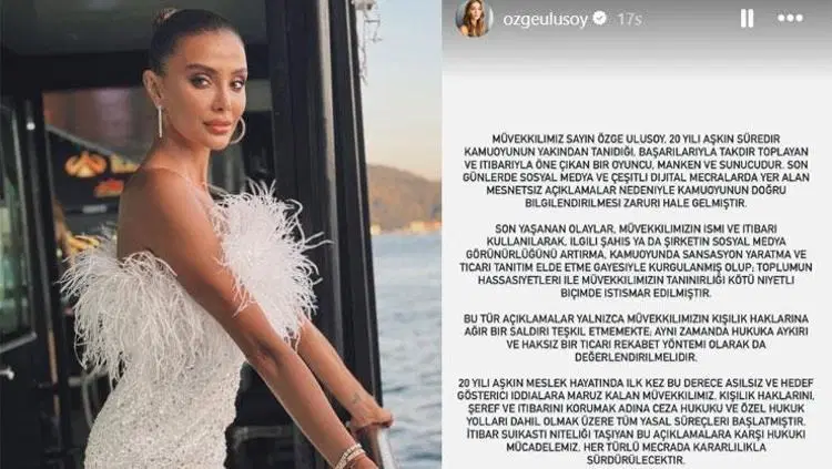 “Müvekkilimiz sayın Özge Ulusoy, 20 yılı aşkın süredir kamuoyunun yakından tanıdığı başarılarıyla takdir toplayan ve itibarıyla öne çıkan bir oyuncu, manken ve sunucudur. Son günlerde sosyal medya ve çeşitli dijital mecralarda yer alan mesnetsiz açıklamalar nedeniyle kamuoyunun doğru bilgilendirilmesi zaruri hale gelmiştir.
