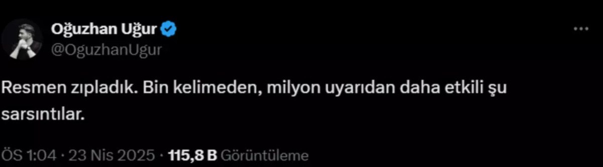 Oğuzhan Uğur paylaşımında “Resmen zıpladık. Bin kelimeden, milyon uyarıdan daha etkili şu sarsıntılar” diyerek paylaştı.