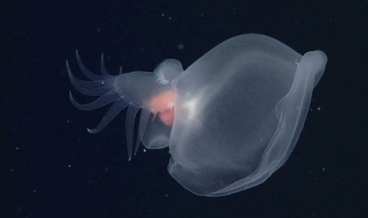 Bathydevius biyolüminesansla parlayan, kürek benzeri bir kuyruğu ve büyük jelatinimsi bir başı olan yüzen bir deniz sümüklüböceği olarak tanıtılıyor. Bu canlının derin okyanusta yaşayan ilk deniz sümüklüböceği olduğu açıklandı.