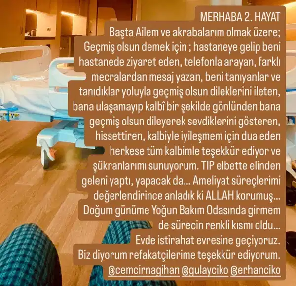 “Başta ailem ve akrabalarım olmak üzere; geçmiş olsun demek için hastaneye gelip beni ziyaret eden, telefonla arayan, farklı mecralardan mesaj yazan, beni tanıyanlar veya tanıdıklar yoluyla geçmiş olsun dileklerini ileten, bana ulaşamayıp kalbi bir şekilde gönlünden bana geçmiş olsun dileyerek sevgi gösteren, hissettiren, kalbiyle iyileşmem için dua eden herkese tüm kalbimle teşekkür ediyor ve şükranlarımı sunuyorum.