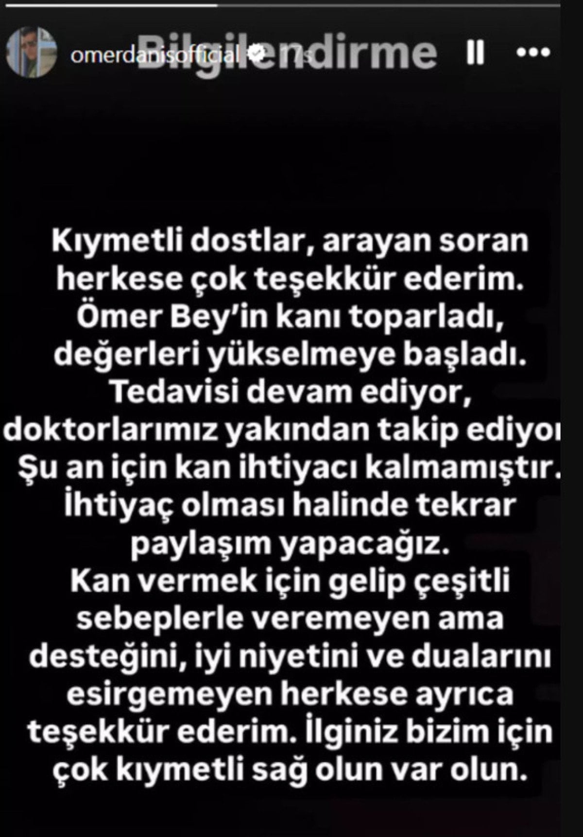 ”Kıymetli dostlar, arayan soran herkese çok teşekkür ederim. Ömer Bey’in kanı toparladı, değerleri yükselmeye başladı. Tedavisi devam ediyor, doktorlarımız yakından takip ediyor. Şu an için kan ihtiyacı kalmamıştır. İhtiyaç olması halinde tekrar paylaşım yapacağız. Kan vermek için gelip çeşitli sebeplerle veremeyen ama desteğini, iyi niyetini ve dualarını esirgemeyen herkese ayrıca teşekkür ederim. İlginiz bizim için çok kıymetli sağ olun var olun” .