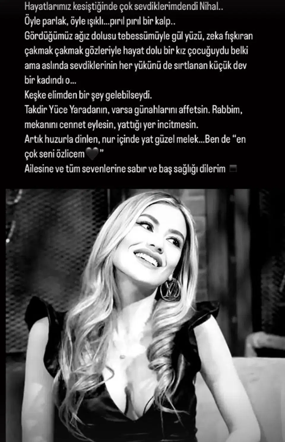 “Keşke elimden bir şey gelebilseydi. Takdir Yüce Yaradanın, varsa günahlarını affetsin. Rabbim, mekanını cennet eylesin, yattığı yer incitmesin. Artık huzurla dinlen, nur içinde yat güzel melek… Ben de en çok seni özleyeceğim. Ailesine ve tüm sevenlerine sabır ve başsağlığı dilerim.”