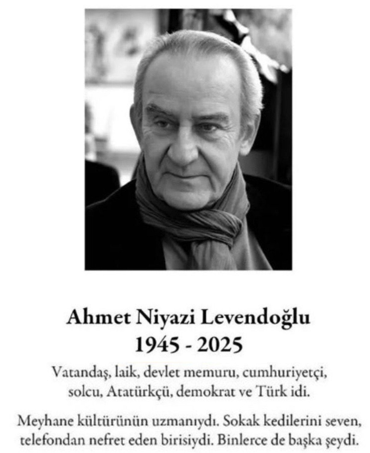 Levendoğlu’nun cenazesi vasiyeti üzerine cenaze namazı kılınmadan Zincirlikuyu Mezarlığı’na defnedildi.