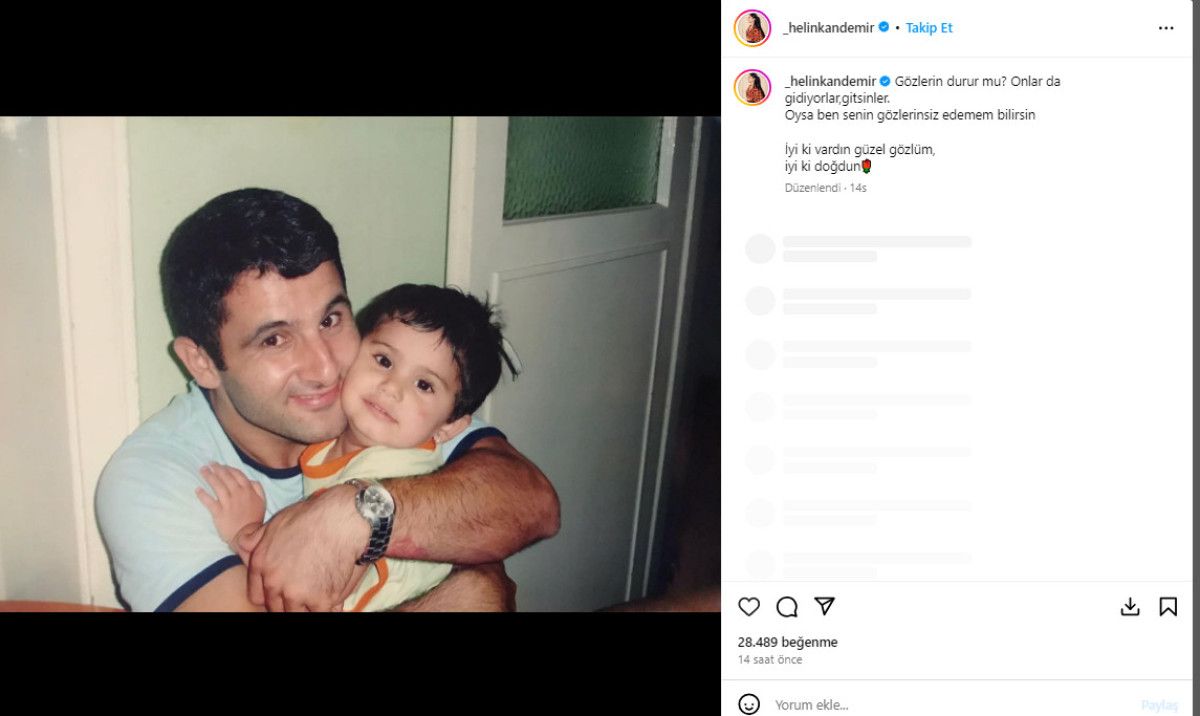 Babasını doğum gününde anan 20 yaşındaki oyuncu, Murat Kandemir ile henüz küçük bir çocukken çekilen fotoğrafa, “Gözlerin durur mu? Onlar da gidiyorlar, gitsinler. Oysa ben senin gözlerinsiz edemem bilirsin. İyi ki vardın güzel gözlüm, iyi ki doğdun.” notunu düştü.