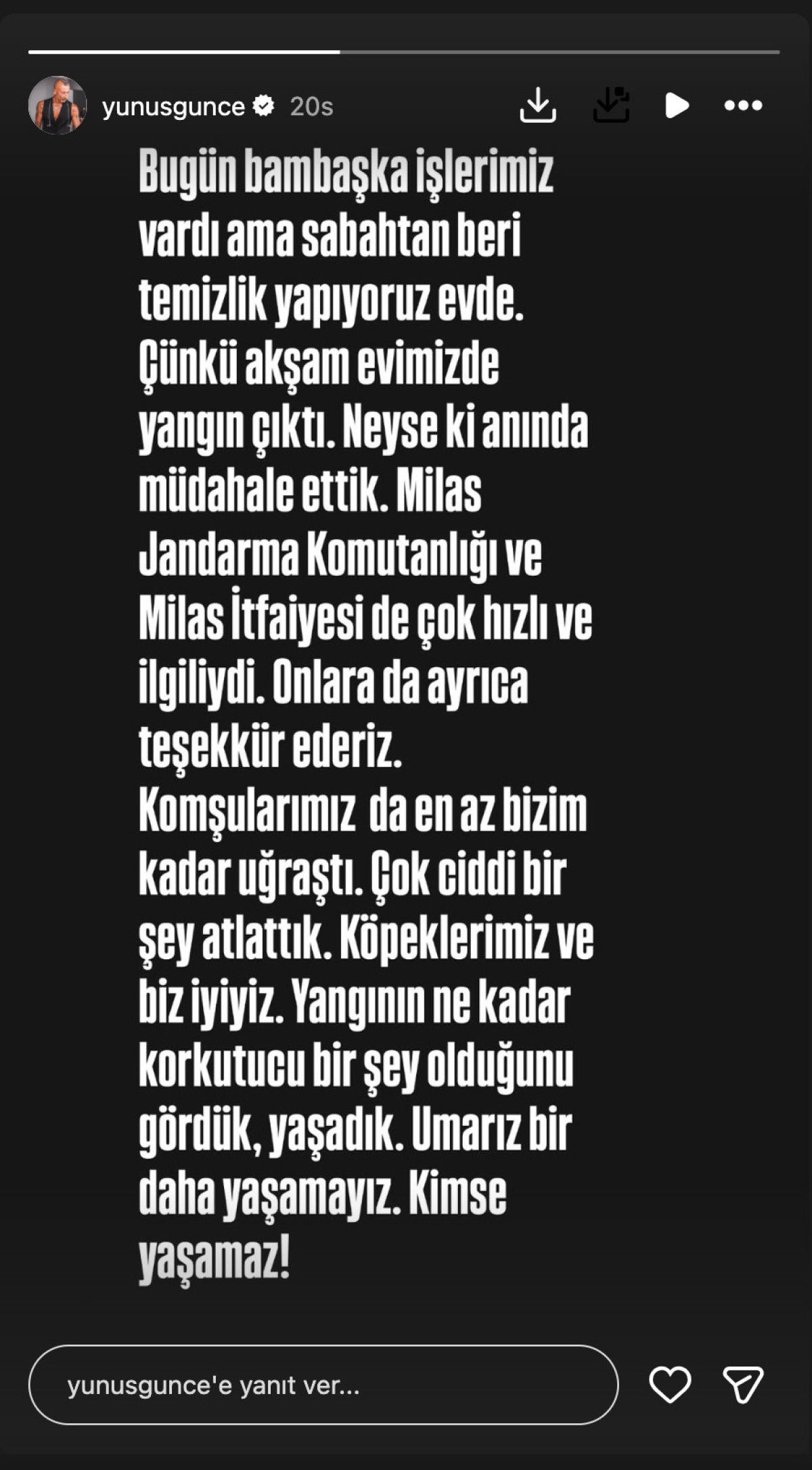 Komşularımız da en az bizim kadar uğraştı. Çok ciddi bir şey atlattık. Köpeklerimiz ve biz iyiyiz. Yangının ne kadar korkutucu bir şey olduğunu gördük, yaşadı. Umarız bir daha yaşamayız. Kimse yaşamaz!”