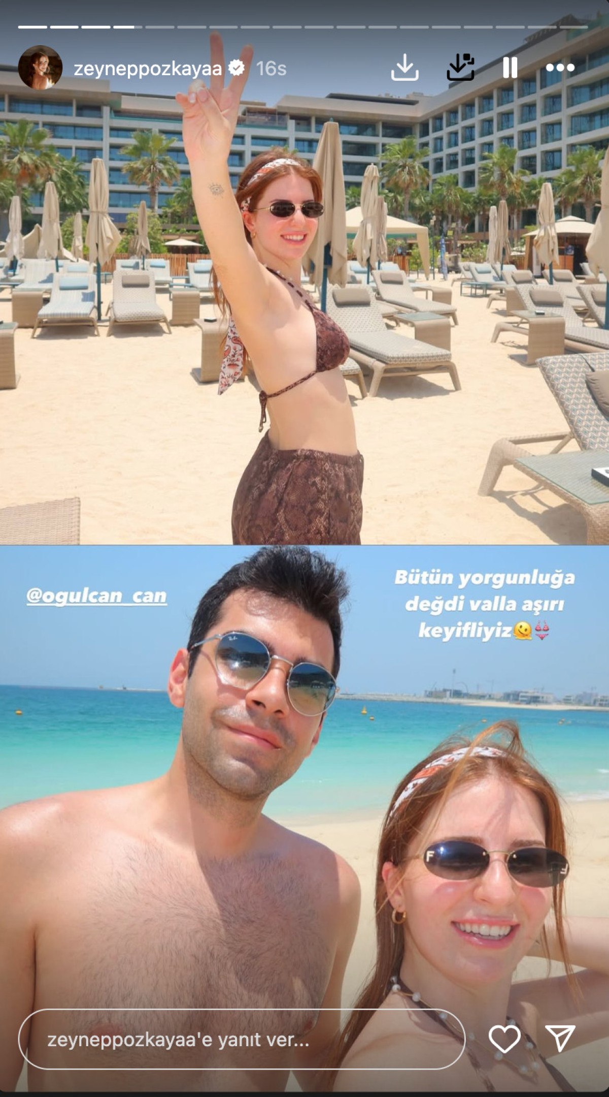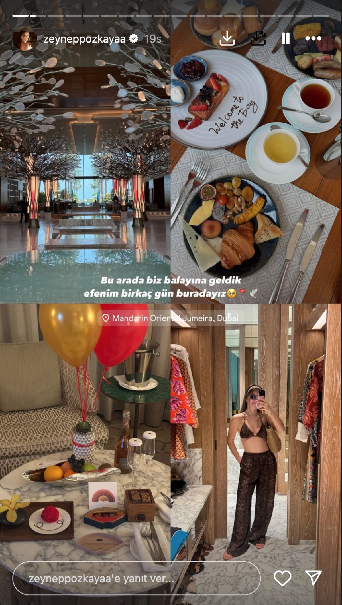 Genç çift düğün sonrası balayı için soluğu Dubai’de aldı. Özkaya, tatil pozlarını Instagram’dan yayımladı. Dubai’ye giden ikiliden oyuncu, balayı pozlarını “Bu arada biz balayına geldik. Birkaç gün buradayız” notuyla sevenlerinin beğenisine sundu.