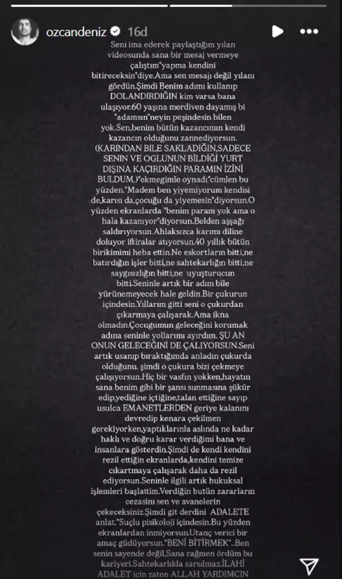 Sessizliğini bozan Özcan Deniz, sosyal medya hesabından yaptığı paylaşımlarla ağabeyini hedef aldı. Deniz, yaptığı açıklamada şu ifadelere yer verdi:
