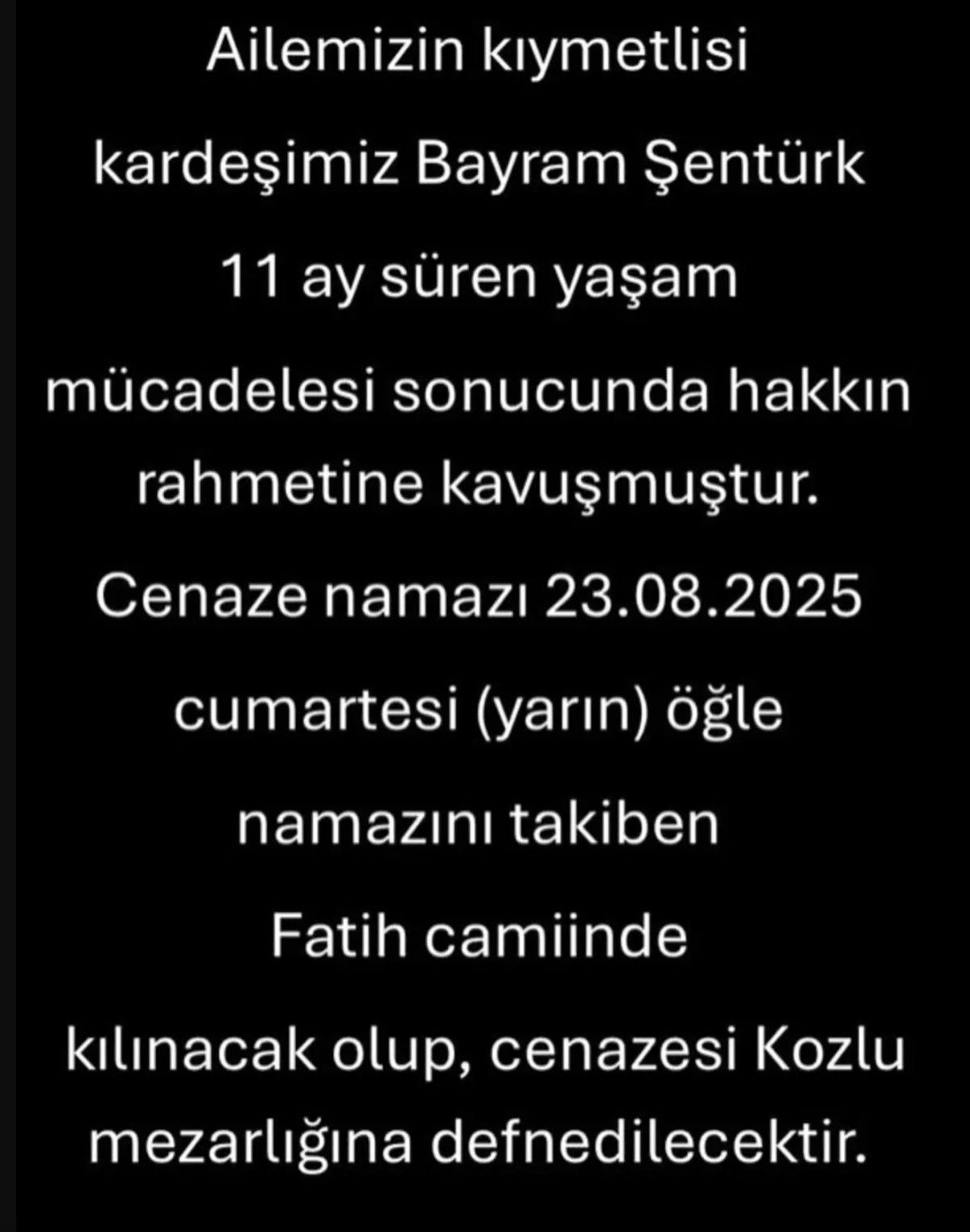Cenaze namazı 23 Ağustos 2025 cumartesi (yarın) öğle namazını takiben Fatih camiinde kılınacak olup, cenazesi Kozlu Mezarlığı’na defnedilecektir.’ sözleriyle duyurdu.