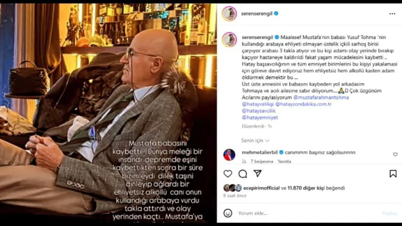 “Maalesef Mustafa’nın babası Yusuf Tohma’nın kullandığı arabaya ehliyeti olmayan, üstelik alkollü sarhoş birisi çarpıyor. Arabası 3 takla atıyor ve bu kişi adamı olay yerinde bırakıp kaçıyor. Hastaneye kaldırıldı fakat yaşam mücadelesini kaybetti. Bu kişinin yakalanması için yetkilileri göreve davet ediyoruz. Hem ehliyetsiz hem alkollü… Bu, kasten adam öldürmek demektir.”