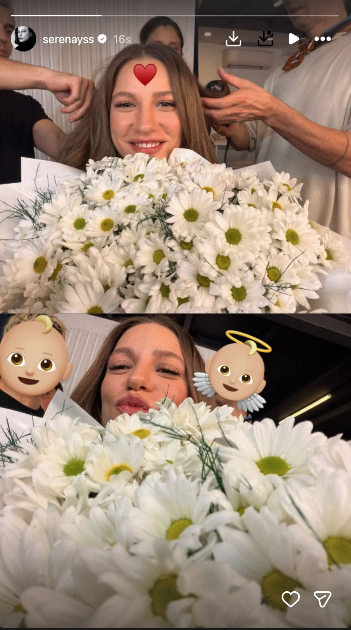 Ünlü oyuncu Serenay Sarıkaya, sosyal medya hesabından paylaştığı bir kare ile dikkat çekti. Sarıkaya, papatya buketleriyle çevrili olduğu anı kırmızı kalp emojisi eşliğinde yayınladı.
