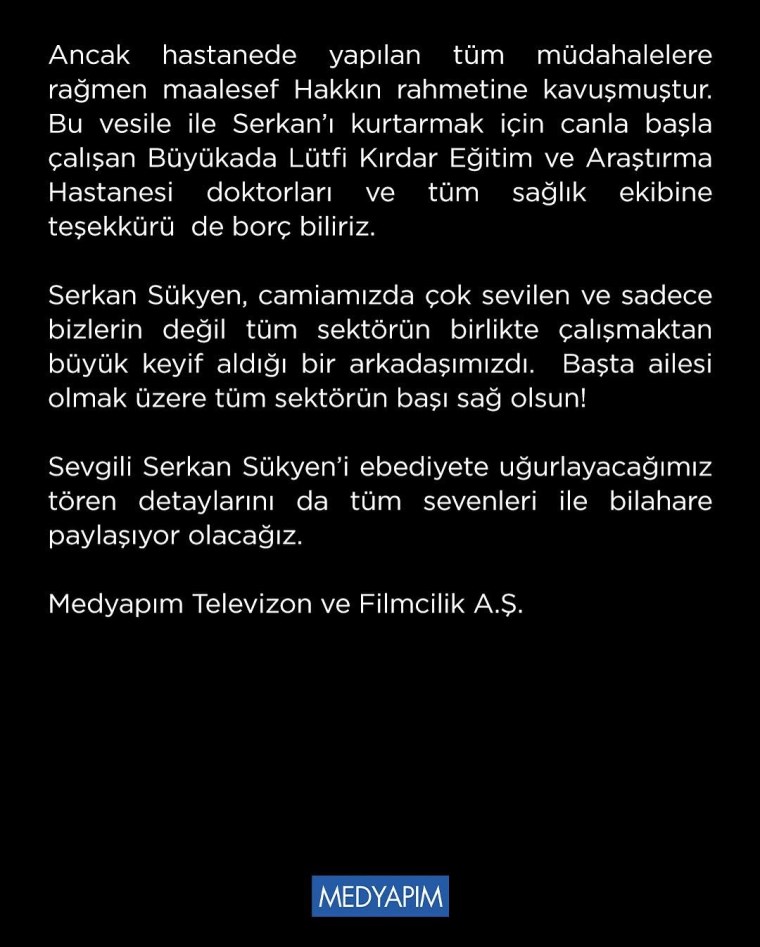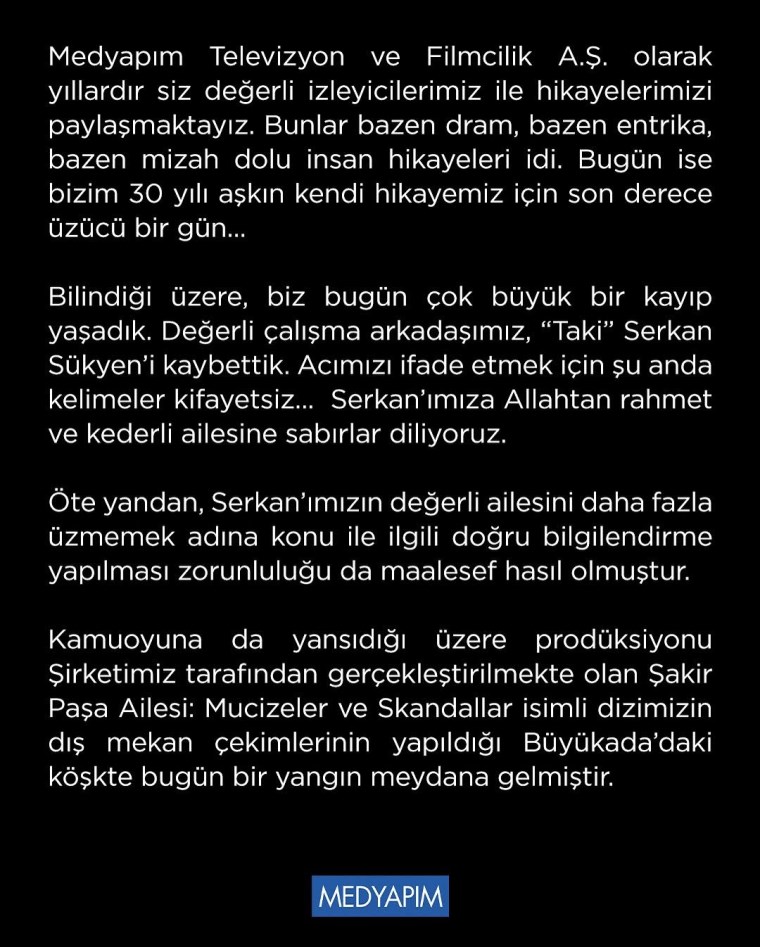 “Medyapım Televizyon ve Filmcilik A.Ş. olarak yıllardır siz değerli izleyicilerimiz ile hikayelerimizi paylaşmaktayız. Bunlar bazen dram, bazen entrika, bazen mizah dolu insan hikayeleri idi. Bugün ise bizim 30 yılı aşkın kendi hikayemiz için son derece üzücü bir gün…