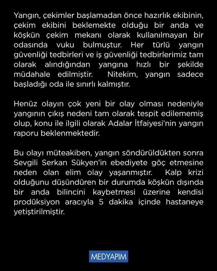 Dizinin yapım şirketi Medyapım, söz konusu olaya ilişkin açıklama yaptı. Açıklamada şunlar kaydedildi: