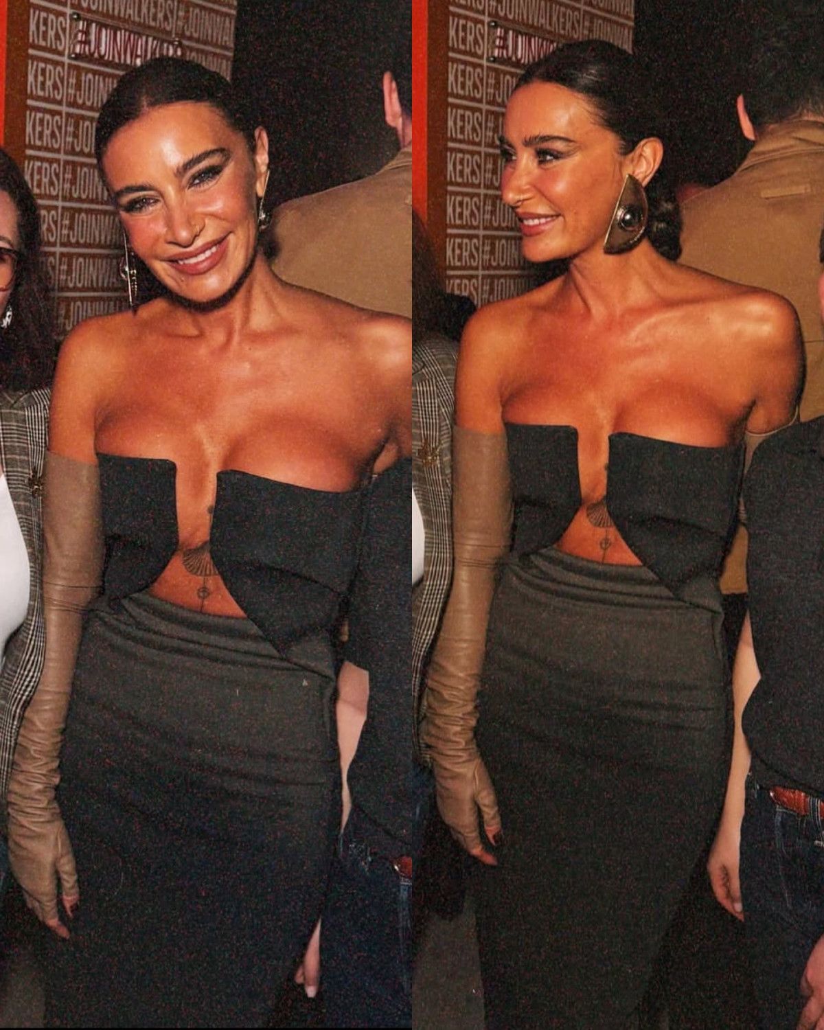 Şarkıcının dar kalıplı elbisesi ve dekoltesi, zarafetini ön plana çıkardı.