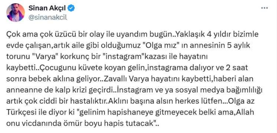 “Çok ama çok üzücü bir olay ile uyandım bugün. Yaklaşık 4 yıldır bizimle evde çalışan, artık aile gibi olduğumuz ‘Olga’mız’ın annesinin 5 aylık torunu ‘Varya’ korkunç bir ‘Instagram’ kazası ile hayatını kaybetti. Çocugunu küvete koyan gelin, Instagram’a dalıyor ve 2 saat sonra bebek aklına geliyor. Zavallı Varya hayatını kaybetti, haberi alan anneanne de kalp krizi geçirdi. Instagram veya sosyal medya bağımlılığı artık çok ciddi bir hastalıktır. Aklını başına alsın herkes lütfen… Olga az Türkçesi ile diyor ki ‘Gelinim hapishaneye gitmeyecek belki ama Allah onu vicdanında ömür boyu hapis tutacak.'”