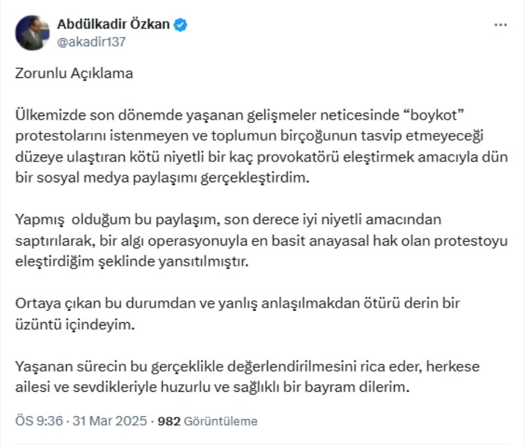 Özkan, ‘boykot’ çağrılarının artması ve tepkilerin ardından sosyal medya hesabından ‘zorunlu açıklama’ notuyla bir paylaşım yaptı: