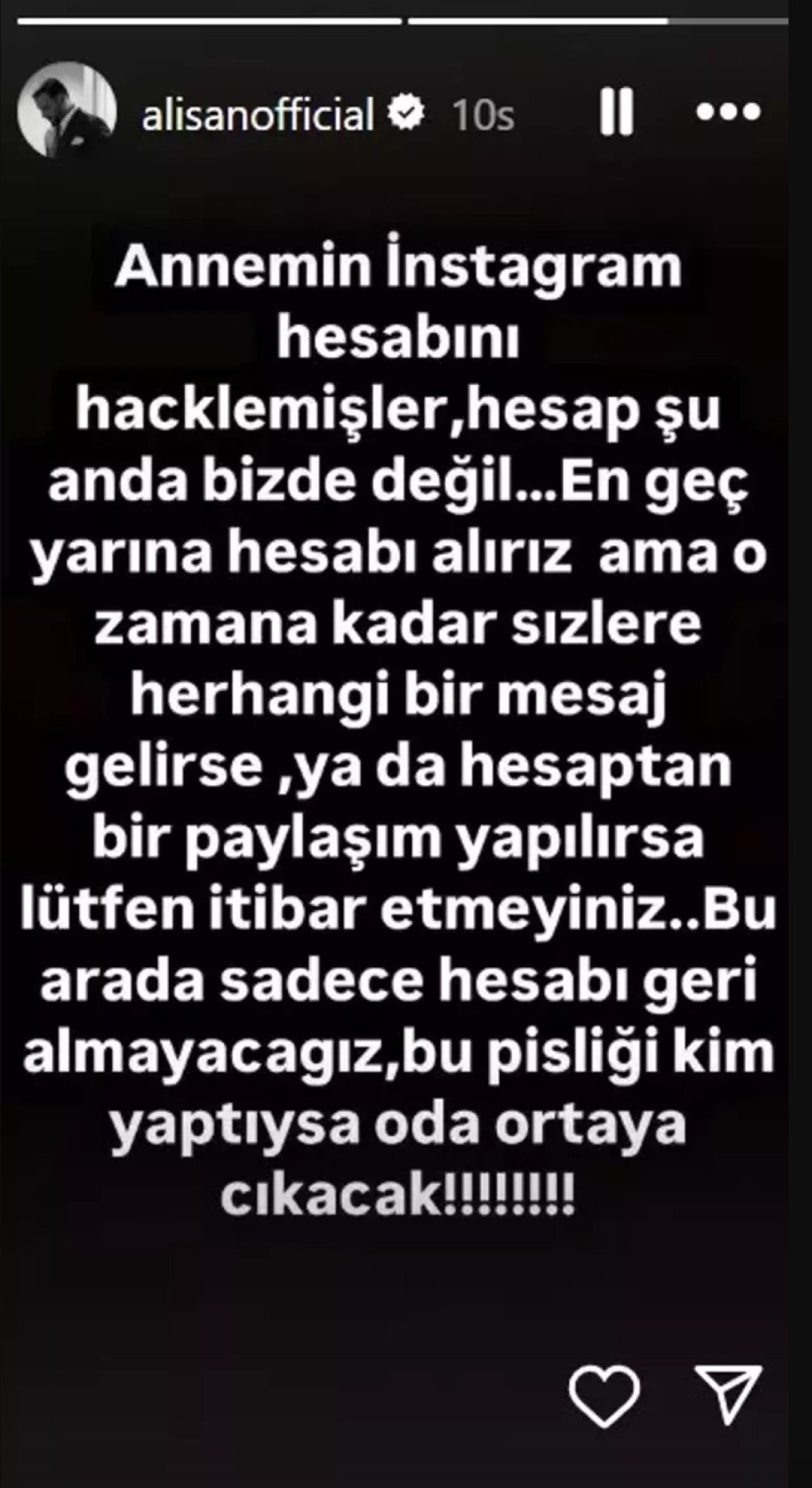 “Annemin Instagram hesabını hacklemişler, hesap şu anda bizde değil… En genç yarına hesabı alırız ama o zamana kadar sizlere herhangi bir mesaj gelirse, ya da hesaptan bir paylaşım yapılırsa lütfen itibar etmeyiniz…