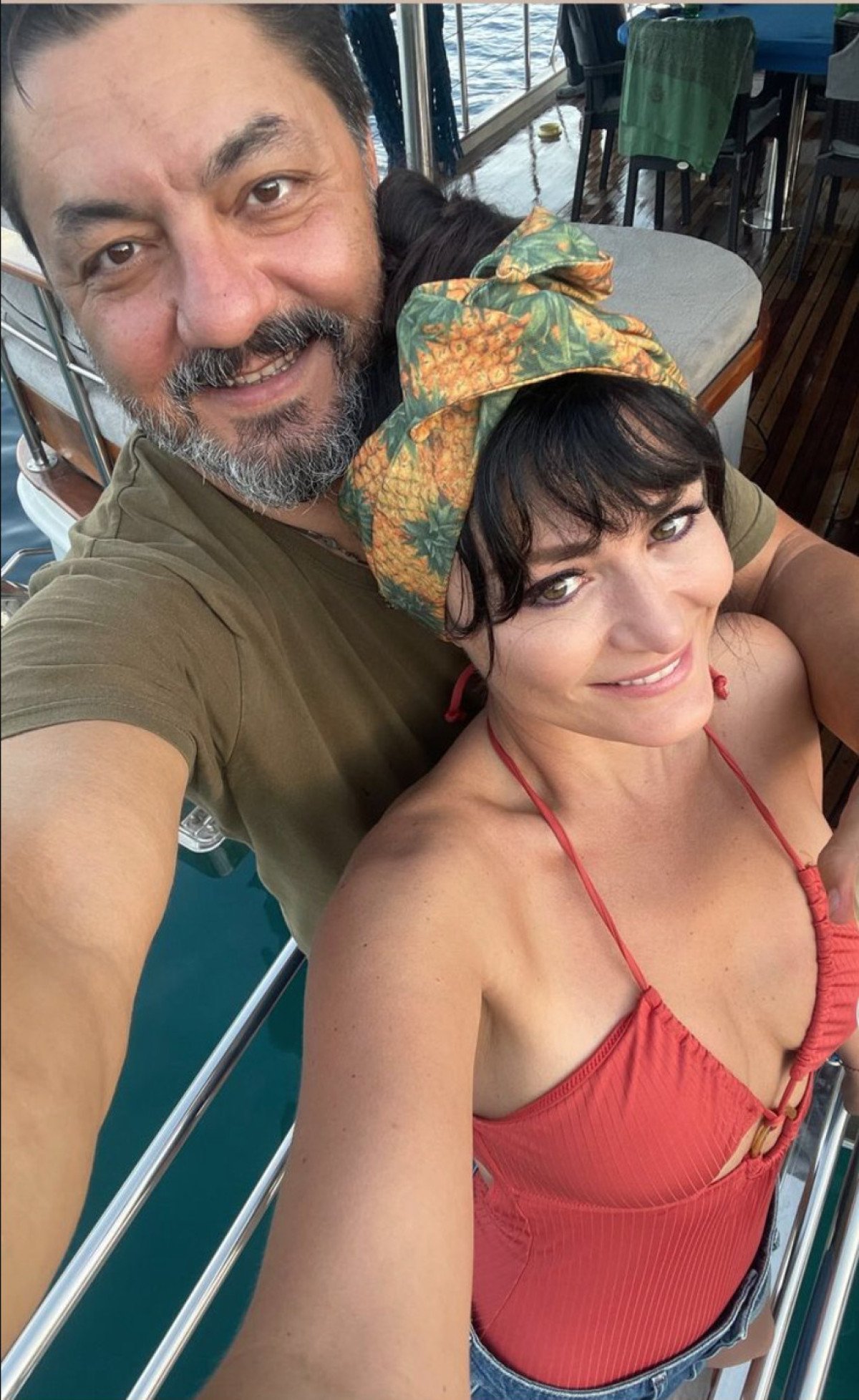 Ünlü oyuncu, eşi Bilgehan Baykal ile birlikte teknede tatilde sarılıp poz verdiği anları toplumsal medya hesabından paylaştı.