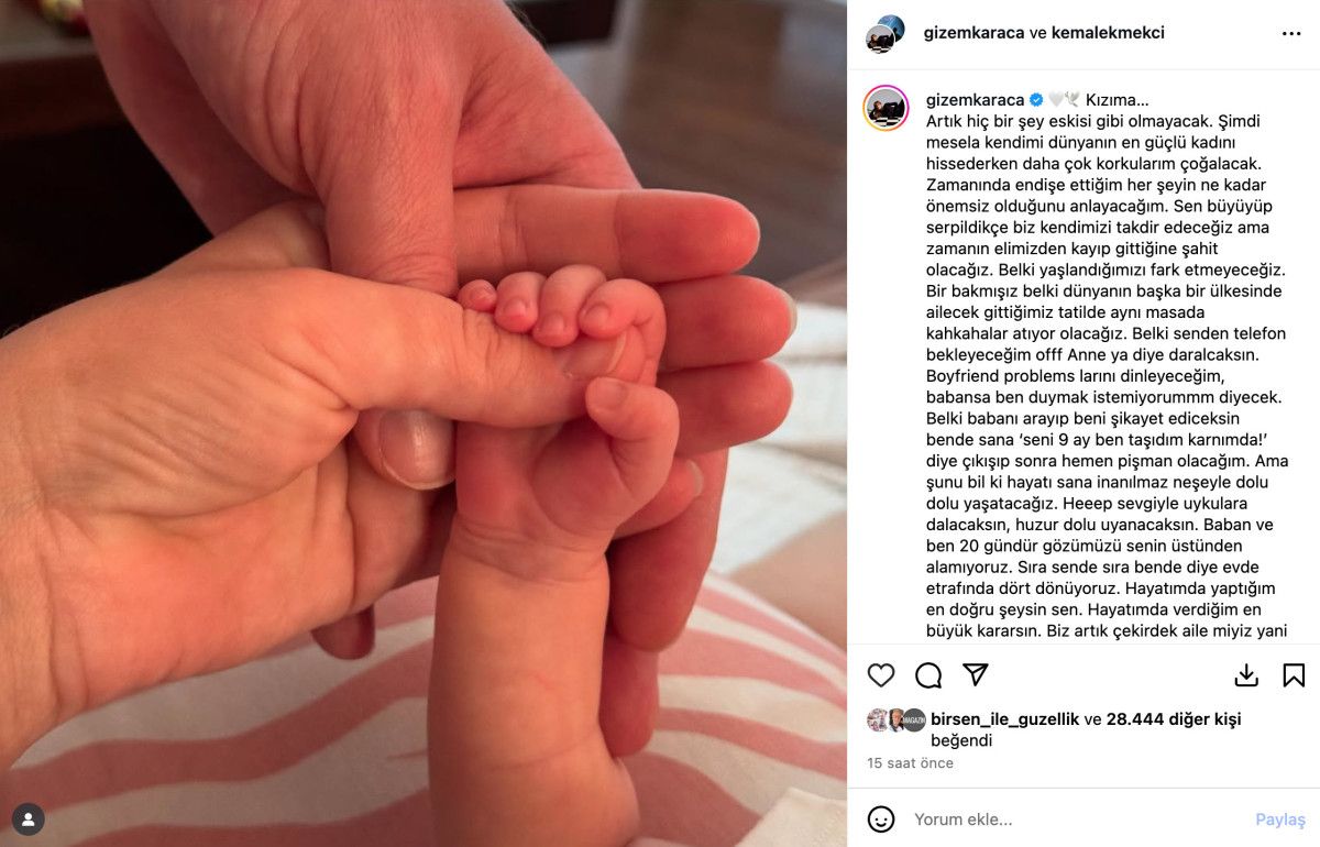 İlk kez anne olmanın keyfini süren ünlü oyuncu Instagram’dan kızı için yazdığı mesajla görenleri duygulandırdı.İşte, Karaca’nın yazdığı o paylaşım: