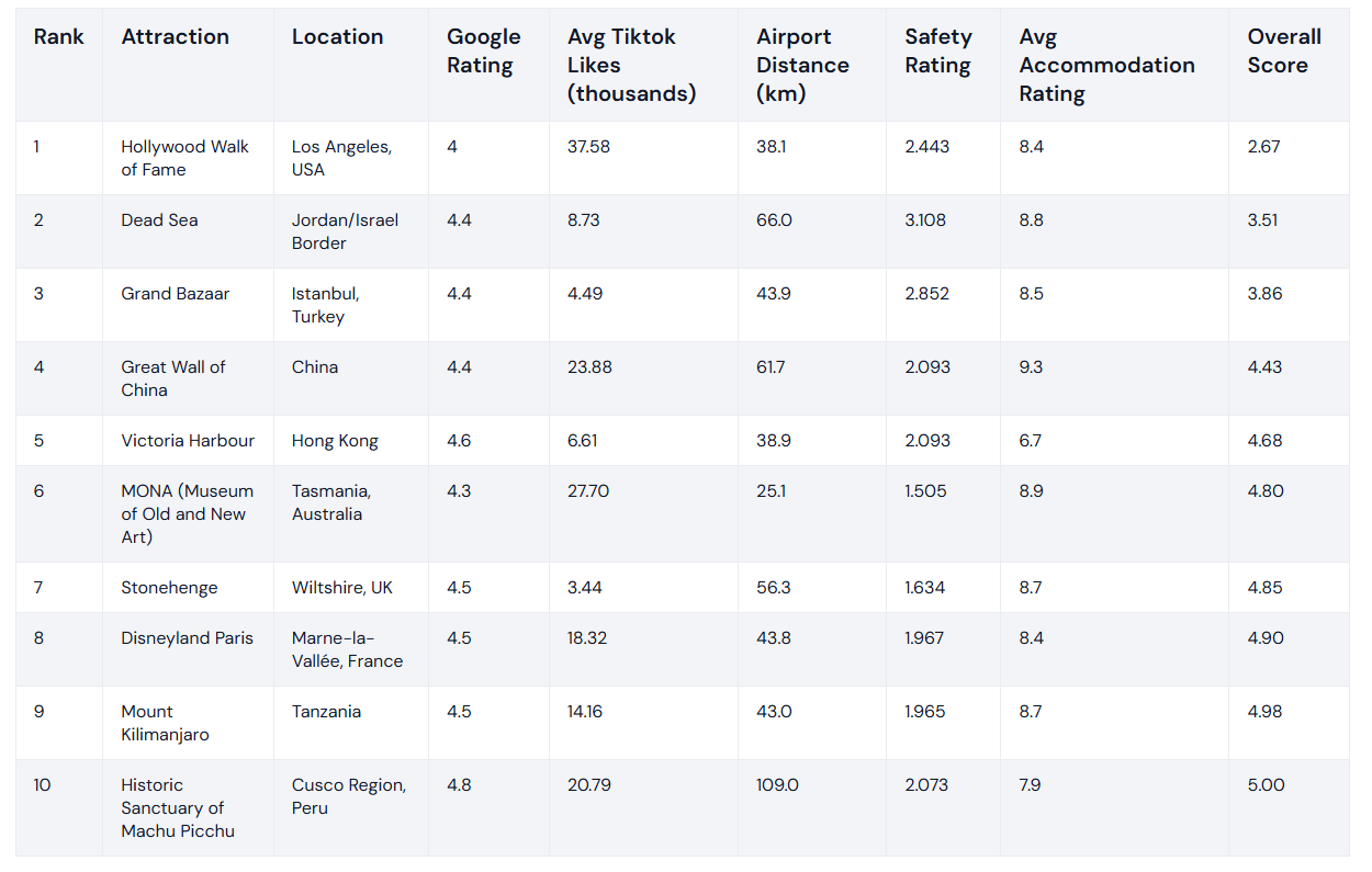 Araştırma sonuçlarına göre ABD’nin Los Angeles kentindeki Hollywood Şöhretler Yolu, 10 üzerinden 2.67 puan alarak listenin ilk sırasında yer aldı. Ünlülerin el izleri ve yıldızlarının bulunduğu kaldırım, bölgenin “tekinsiz” oluşu ve aşırı kalabalık nedeniyle ziyaretçilerin beklentilerini karşılamıyor.