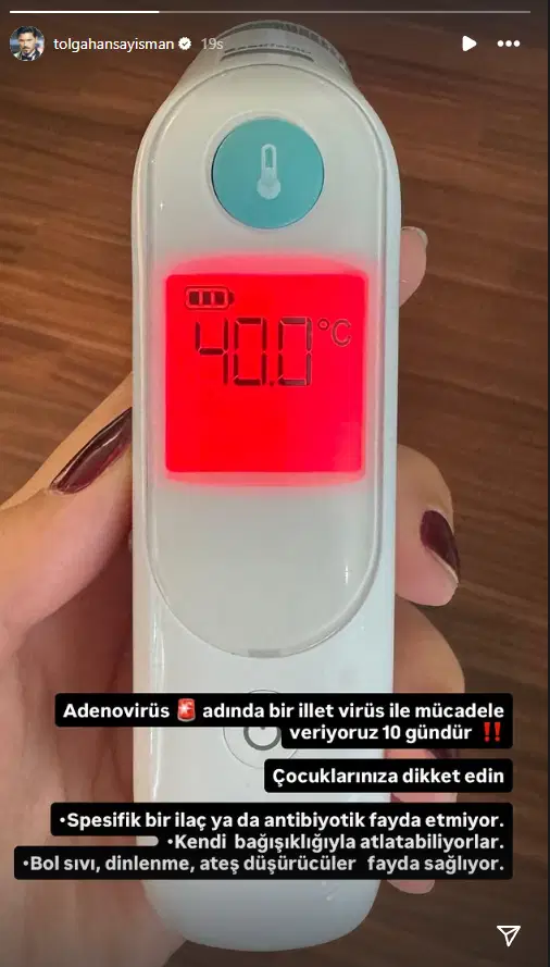 “Adenovirüs adında bir illet virüs ile mücadele veriyoruz 10 gündür. Çocuklarınıza dikkat edin. Spesifik bir ilaç ya da antibiyotik fayda etmiyor. Kendi bağışıklığıyla atlatabiliyorlar. Bol sıvı, dinlenme, ateş düşürücüler fayda sağlıyor.”