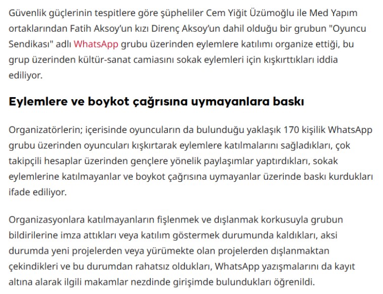 TRT, söz konusu soruşturmanın ayrıntılarına ilişkin bir haber servis etti. Haberde, “Oyuncu Sendikası” adlı WhatsApp grubunda bulunan kişilerin ‘dışlanmamak’ için konuşmaları kayıt altına alarak şikayetçi olduğu yazıyor.